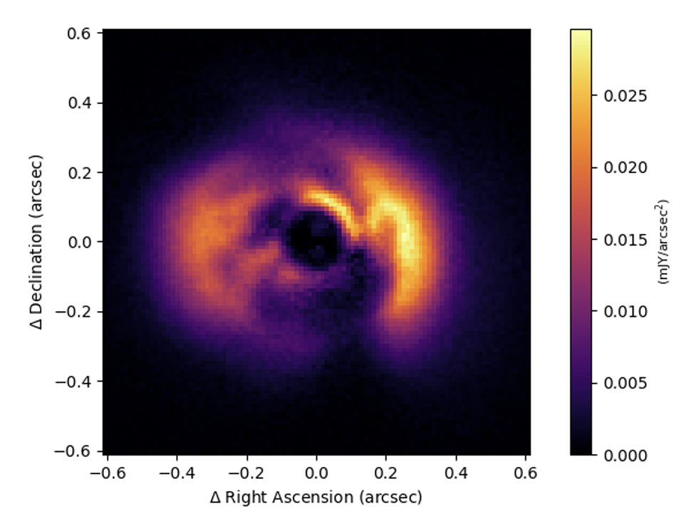 PaperAbstract: We report Very Large Array observations at 7 mm, 9 mm, and 3 cm toward the pre-transitional disk of the Herbig Ae star HD 169142. These observations have allowed us to study the millimeter emission of this disk with the highest angular resolution so far (0 12 × 0 09, or 14 au × 11 au, at 7 mm). Our 7 and 9 mm images show a narrow ring of emission at a radius of ∼25 au tracing the outer edge of the inner gap. This ring presents an asymmetric morphology that could be produced by dynamical interactions between the disk and forming planets. Additionally, the azimuthally averaged radial intensity profiles of the 7 and 9 mm images confirm the presence of the previously reported gap at ∼45 au and reveal a new gap at ∼85 au. We analyzed archival DCO+(3–2) and C18O(2–1) ALMA observations, showing that the CO snowline is located very close to this third outer gap. This suggests that growth and accumulation of large dust grains close to the CO snowline could be the mechanism responsible for this proposed outer gap. Finally, a compact source of emission is detected at 7 mm, 9 mm, and 3 cm toward the center of the disk. Its flux density and spectral index indicate that it is dominated by free–free emission from ionized gas, which could be associated with the photoionization of the inner disk, an independent object, or an ionized jet.
